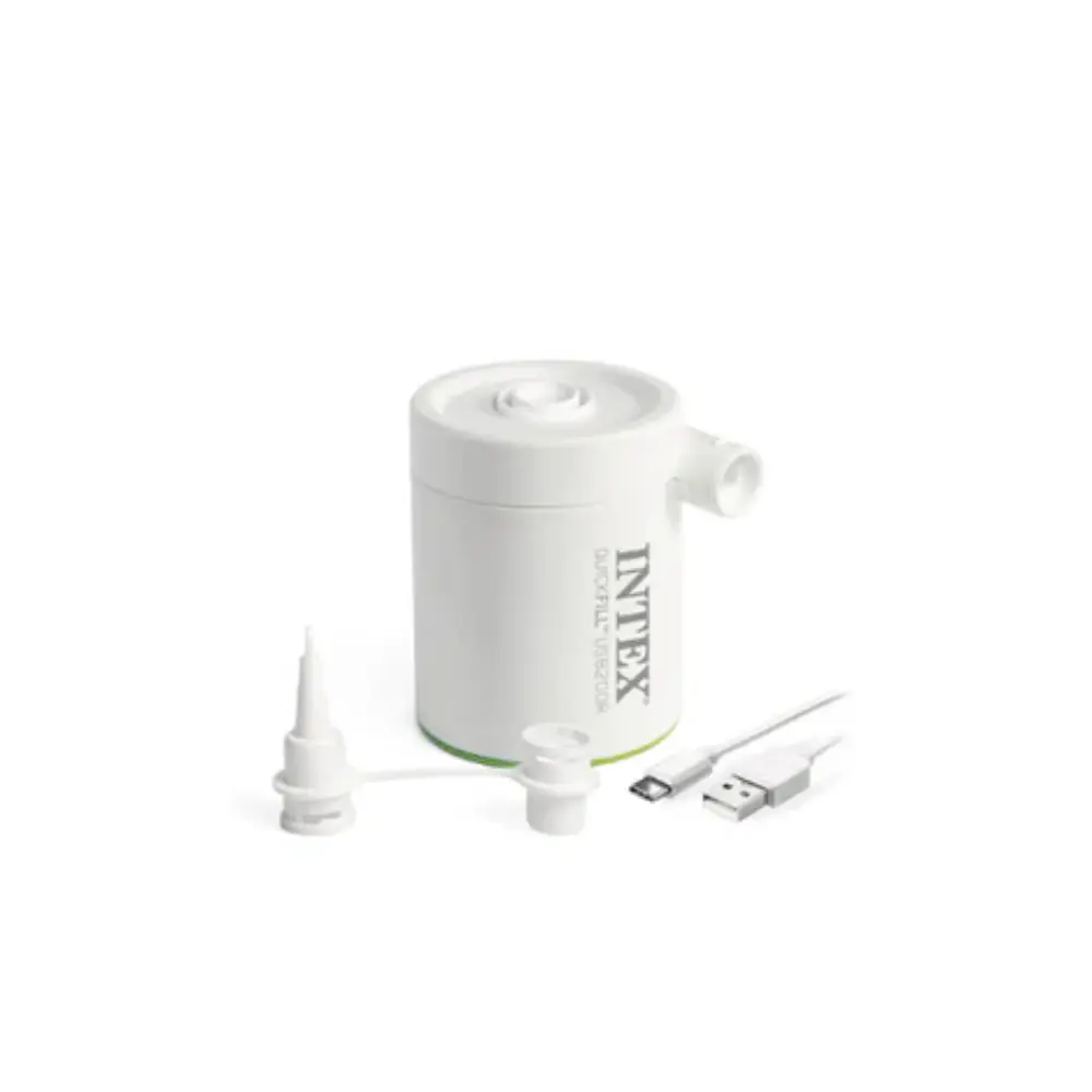 Take the INTEX® QuickFill® USB Rechargeable Air Pump along on your next outdoor adventure. It can inflate or deflate pool floats, camping mats, air mattresses, and more but fits right in your hand. The included adapter with 2 nozzles makes this pump a versatile match for different valves. Charge it via USB-A port or home outlet (USB-A cube not included)—it even doubles as a power bank to charge other USB devices.