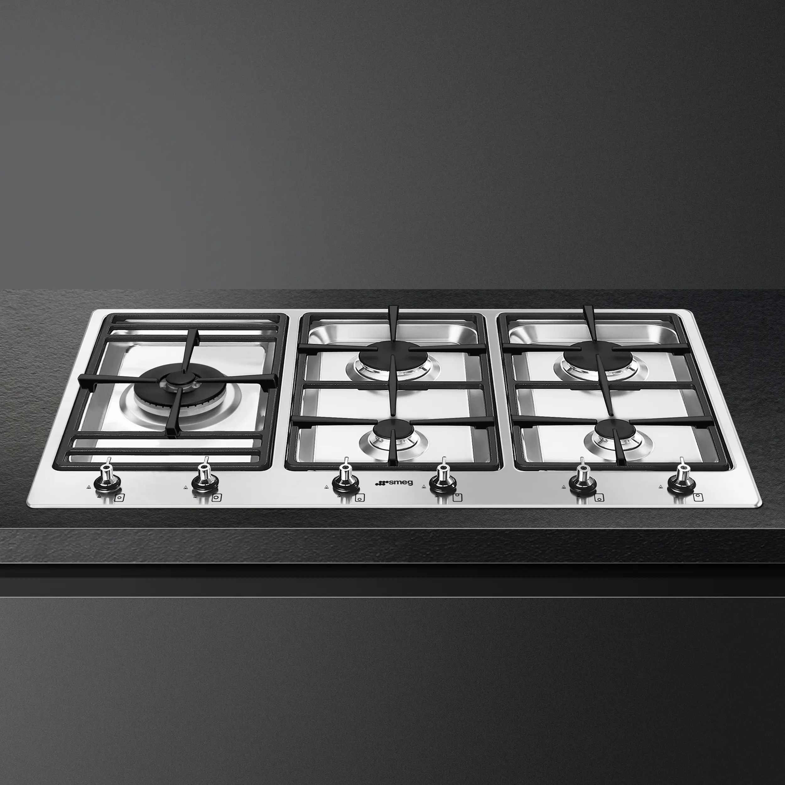 The Smeg 90cm Classica Traditional gas hob has 5 Burners with Electric Ignition and Cast Iron pan stands.