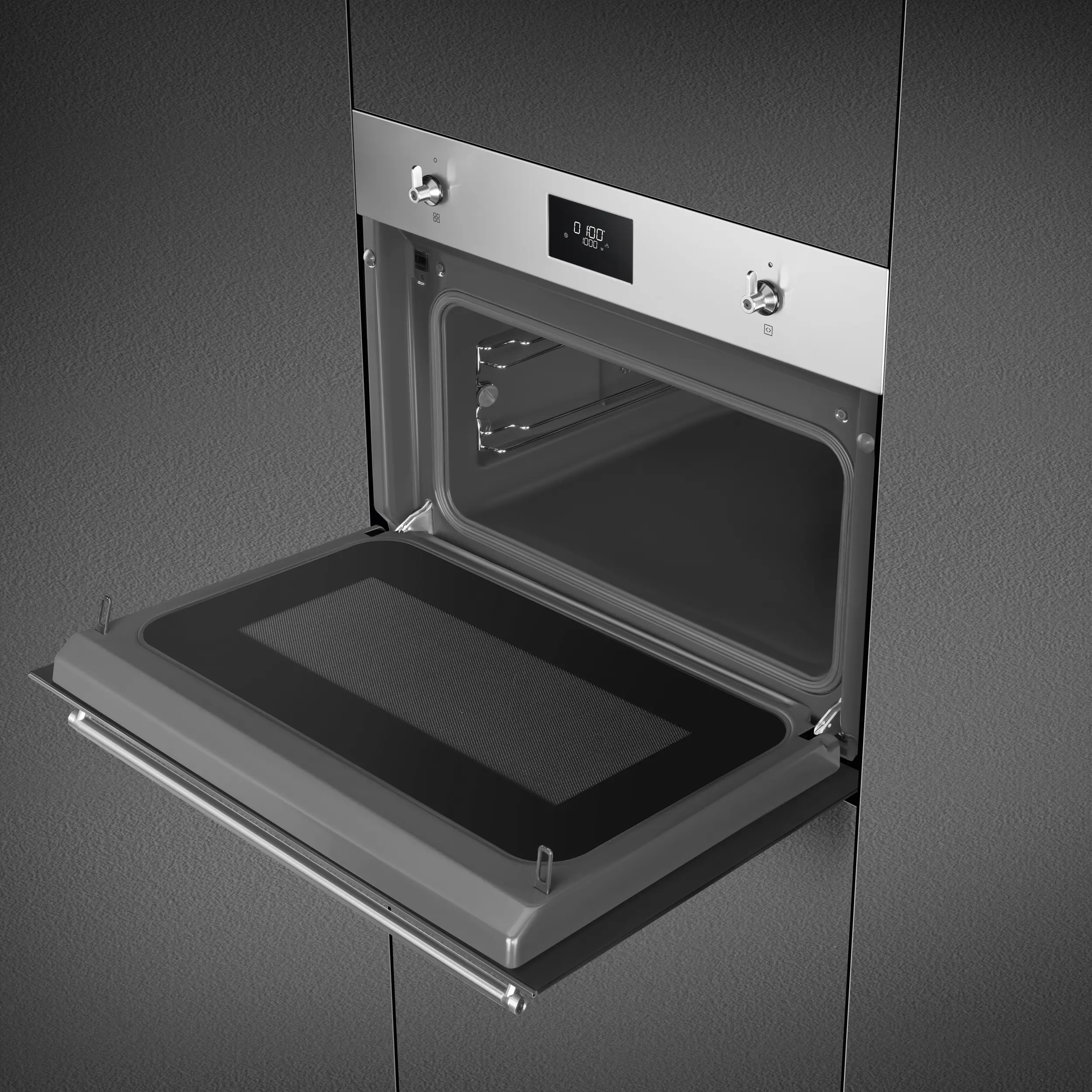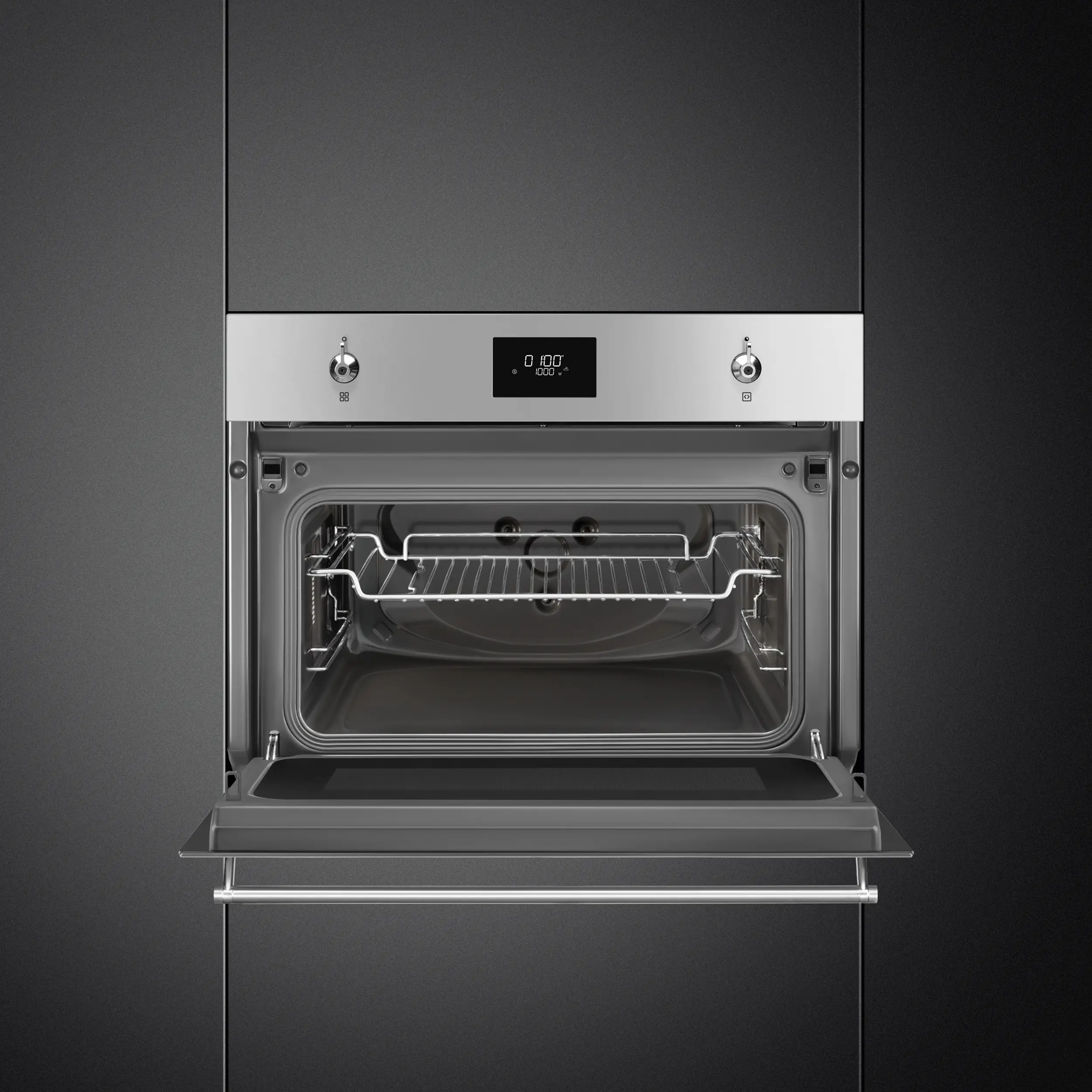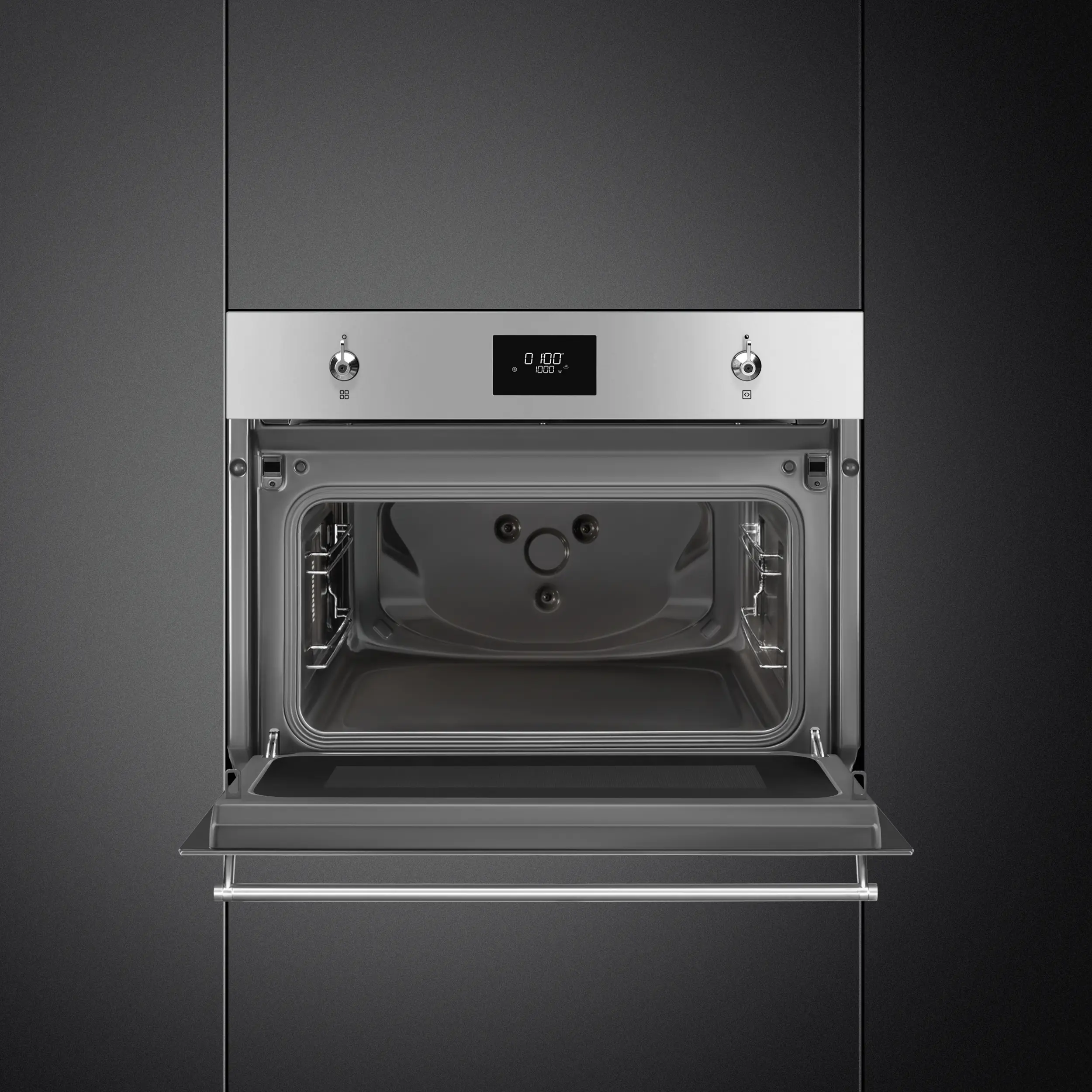 This Smeg Classica compact stainless steel microwave has a 40 litre capacity with a grill and child lock function .