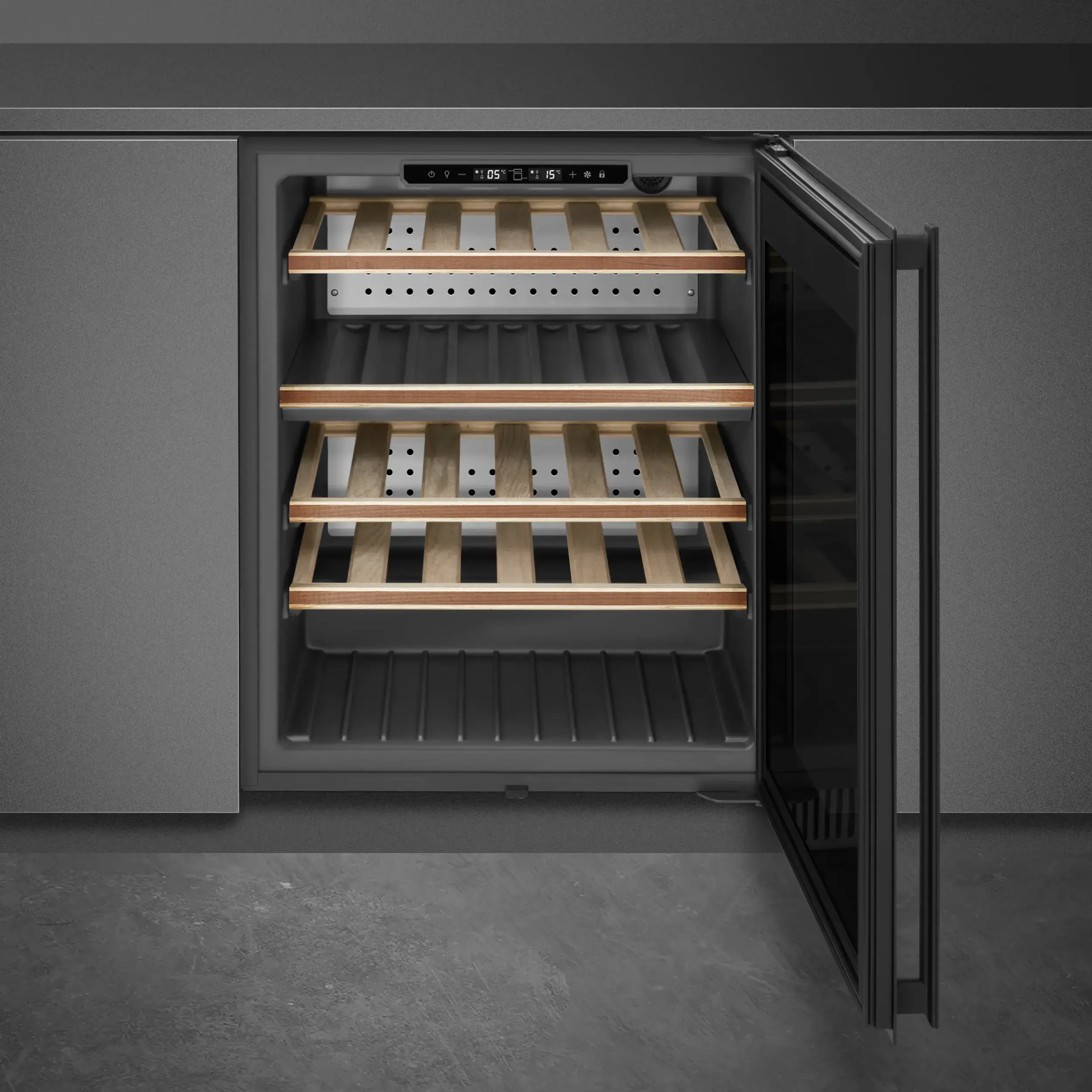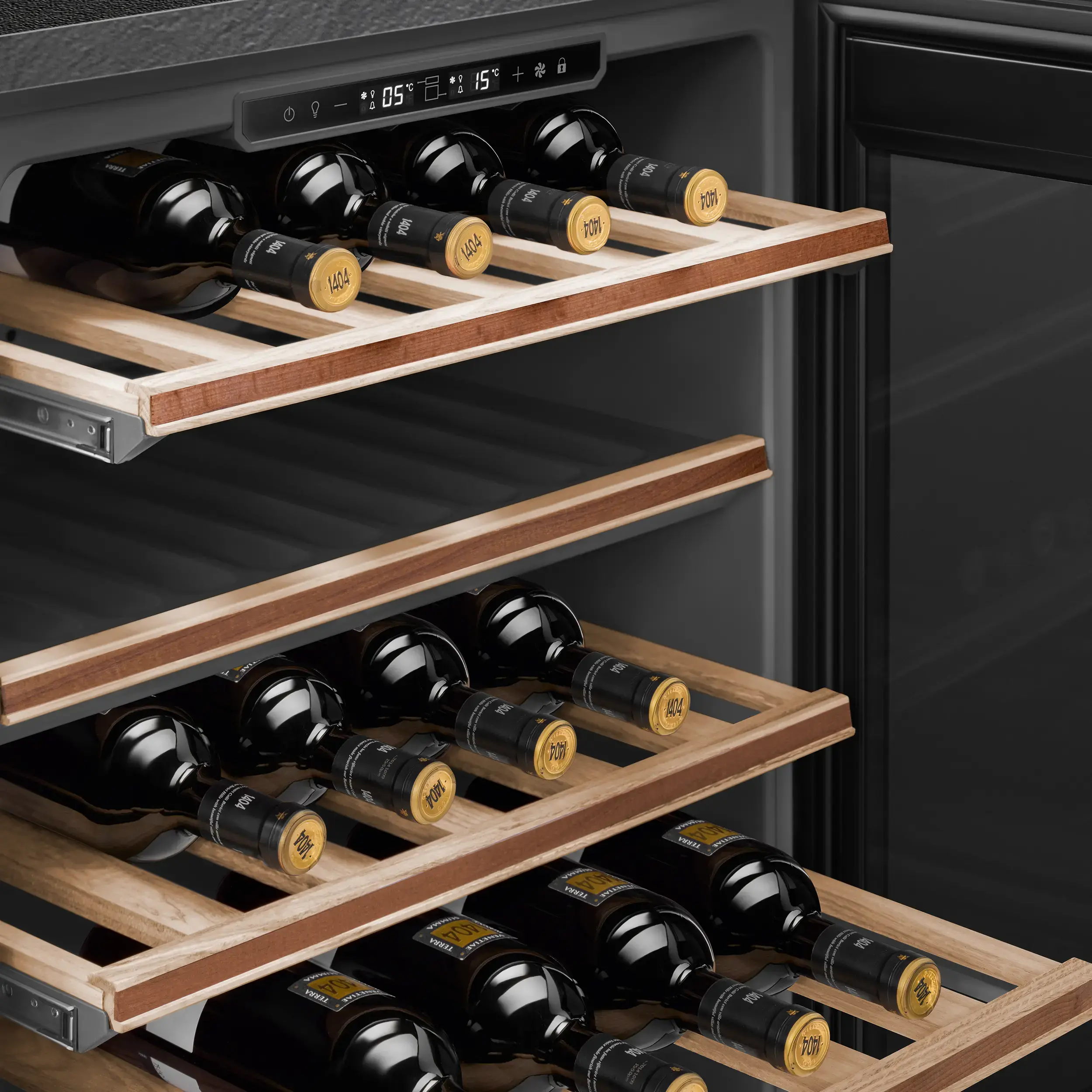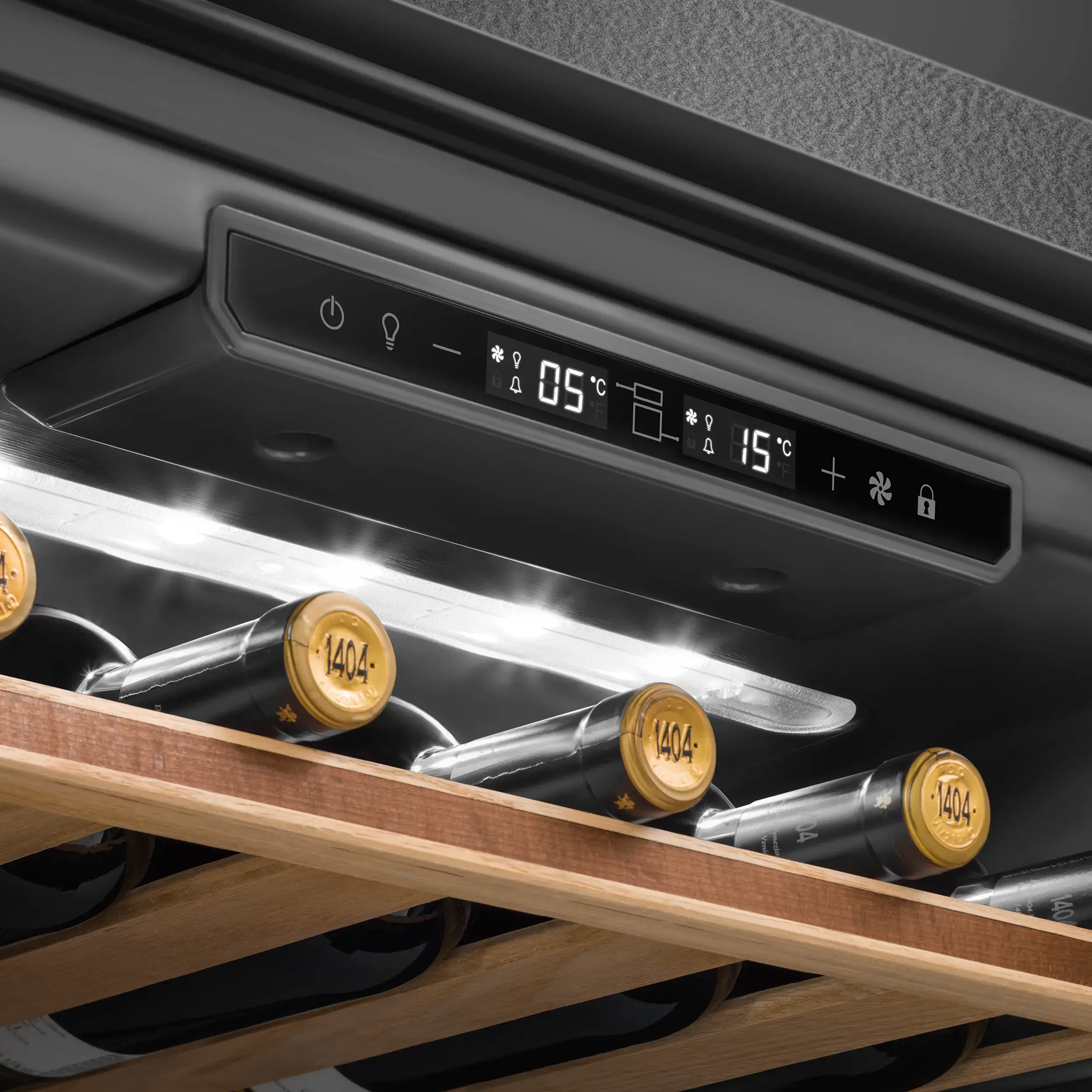 38 bottles/114L wine storage (Net capacity) • Double glazed, UV resistant black glass door • Internal LED lighting • Fan assisted ventilation system • 2 fixed Slavonia oak shelves • 3 adjustable Slavonia oak shelves (with telescopic guides) • 2 independent cooling systems & temperature zones (each with 5-20°C adjustable temperature range) • Activated charcoal air filter • Touch control display • Door and temperature alarm • Secure lock at base