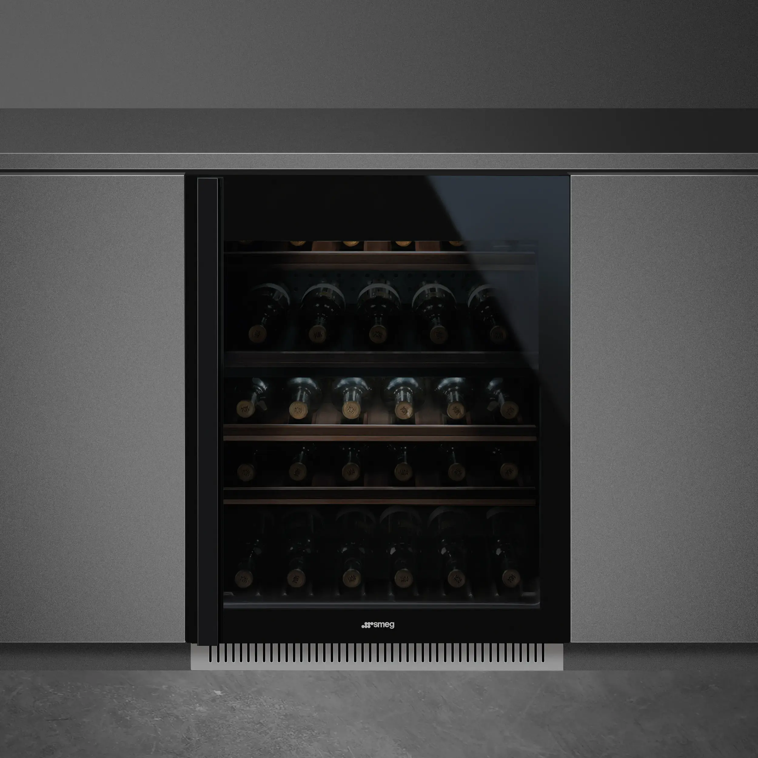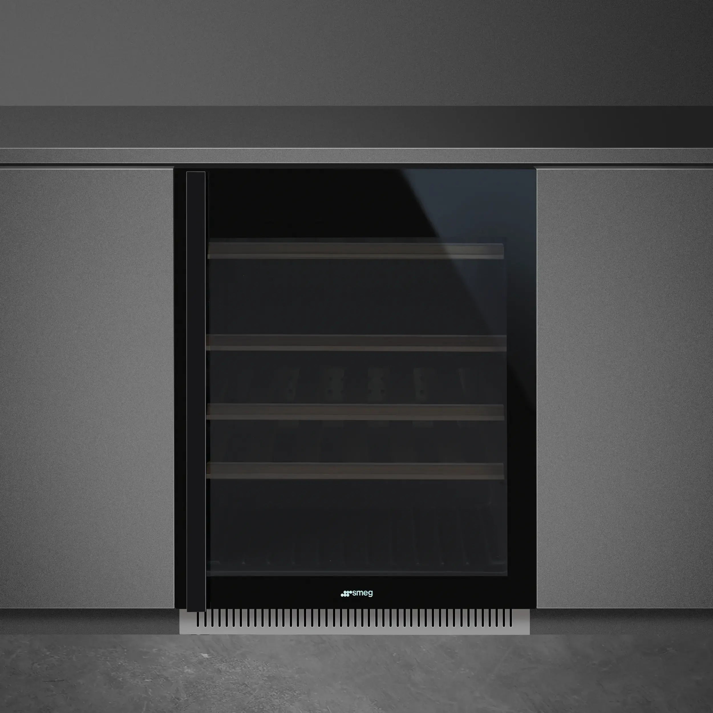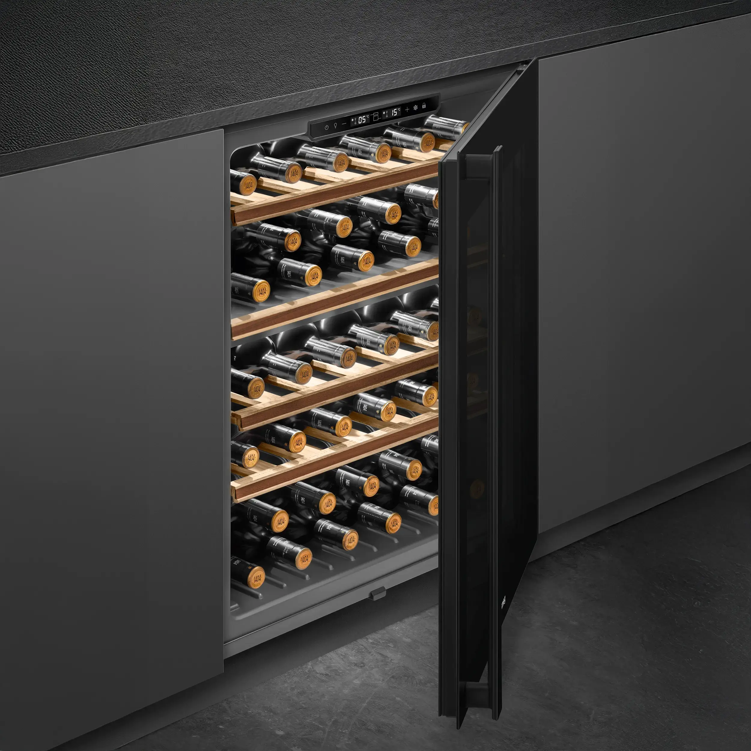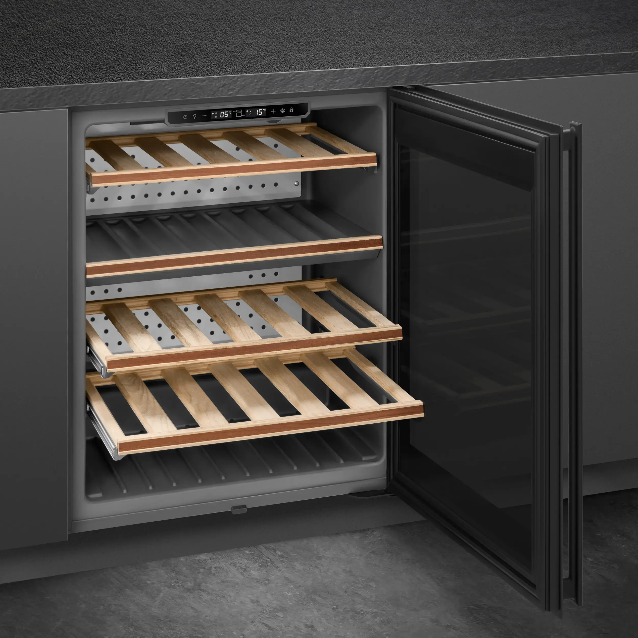 38 bottles/114L wine storage (Net capacity) • Double glazed, UV resistant black glass door • Internal LED lighting • Fan assisted ventilation system • 2 fixed Slavonia oak shelves • 3 adjustable Slavonia oak shelves (with telescopic guides) • 2 independent cooling systems & temperature zones (each with 5-20°C adjustable temperature range) • Activated charcoal air filter • Touch control display • Door and temperature alarm • Secure lock at base