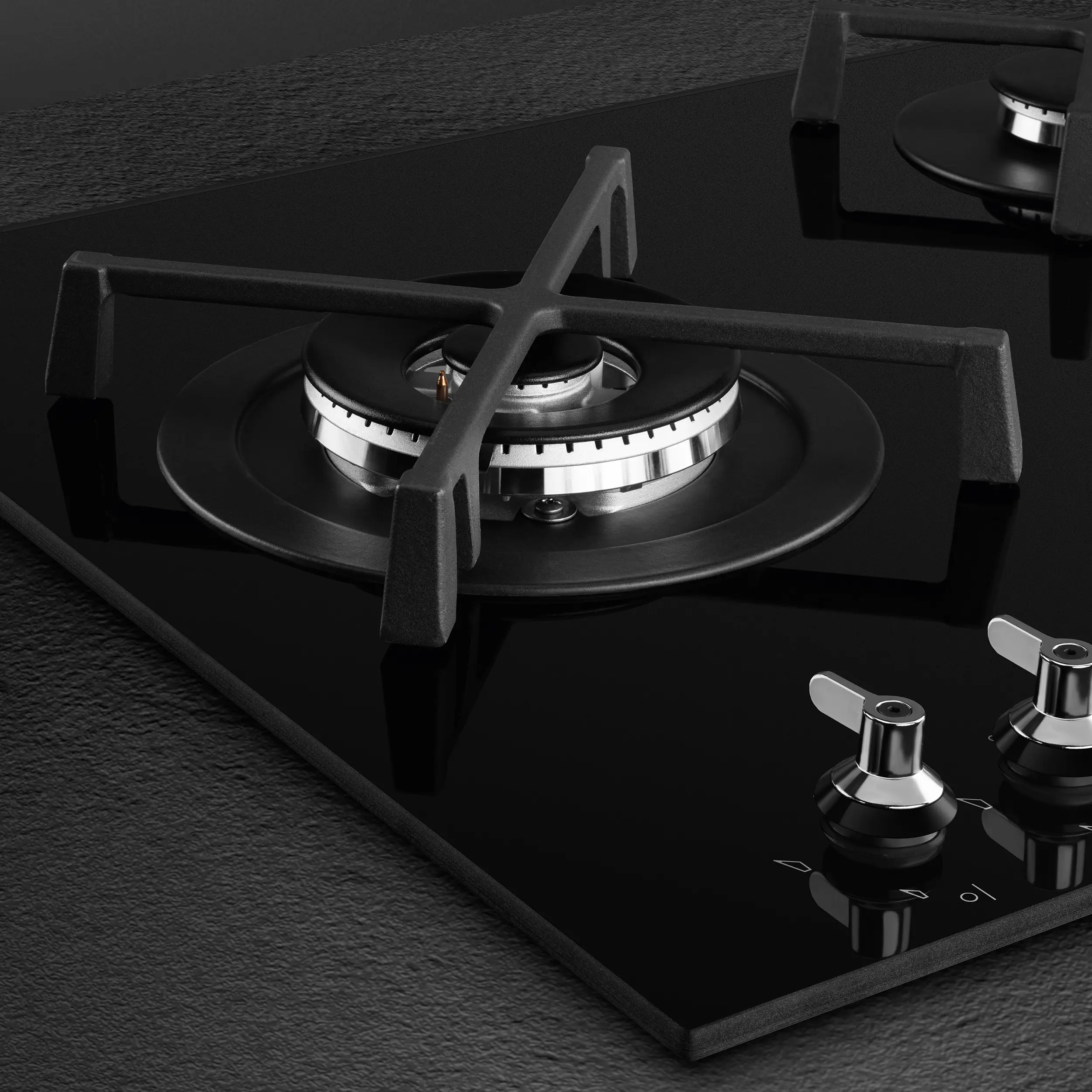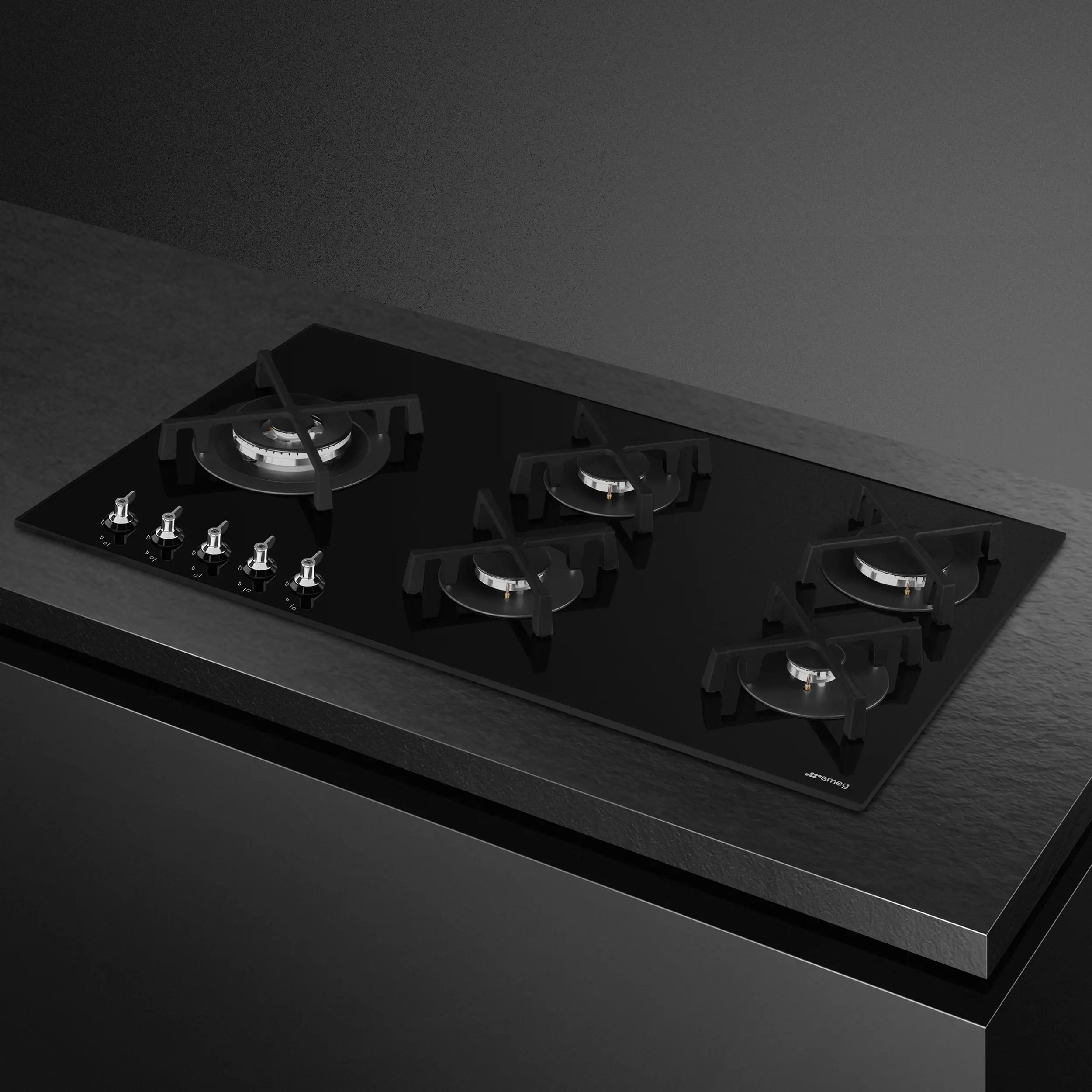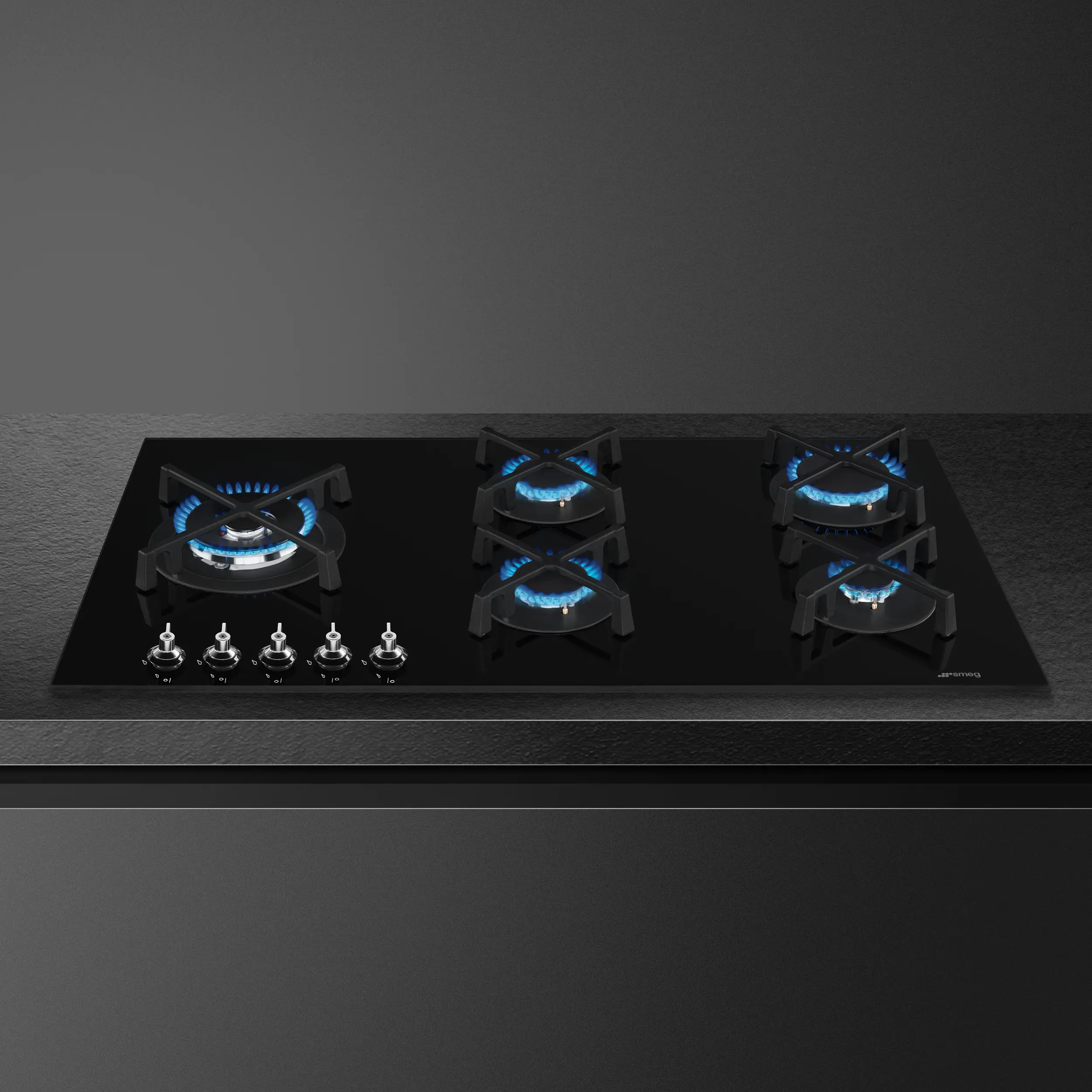 Black glass set on stainless steel • 5 High-e_x001a_ciency gas burners (11.2kW combined output) • Heavy duty cast-iron pan stands • GasSafety™ cut-out device • Adaptable for LPG or Natural Gas • Classic controls