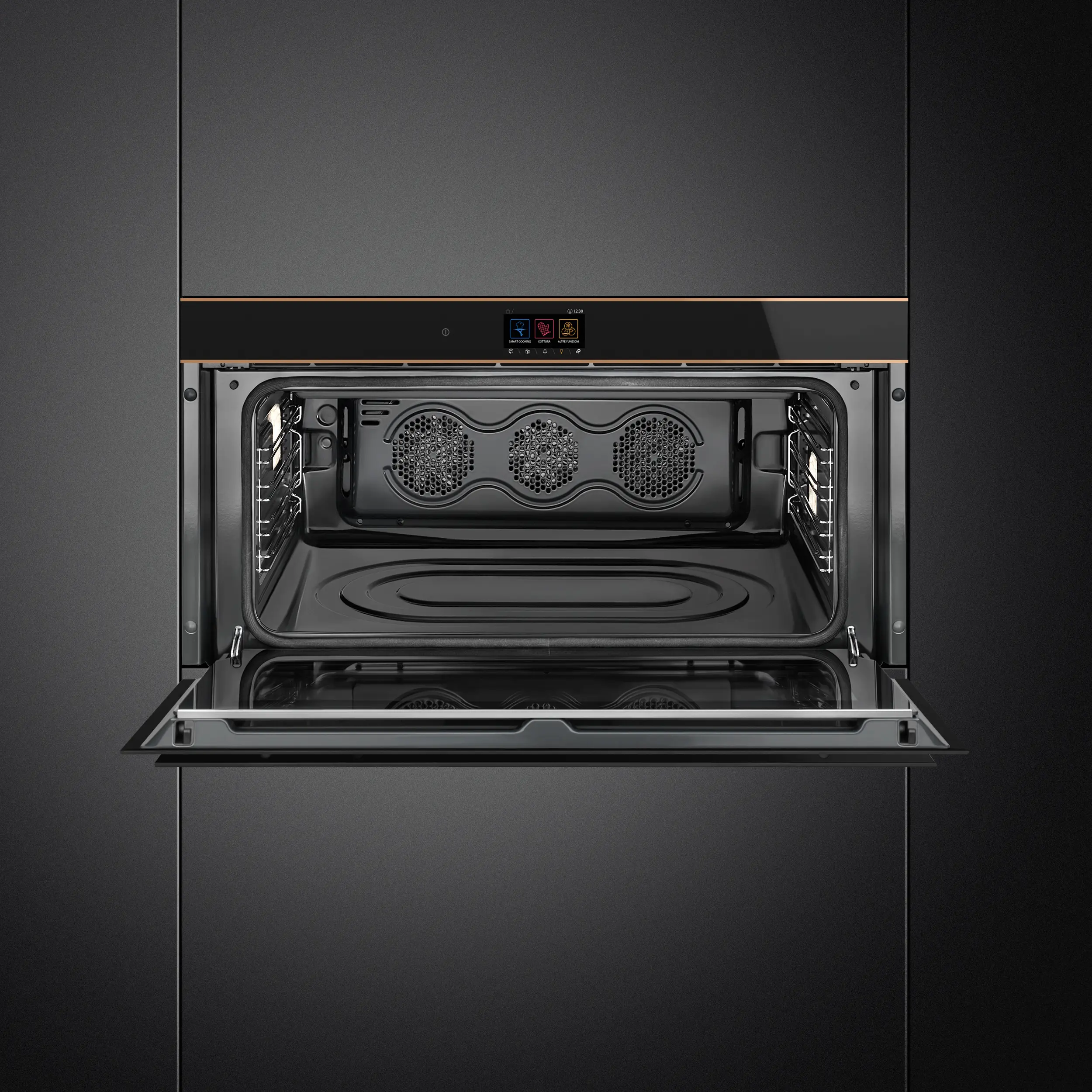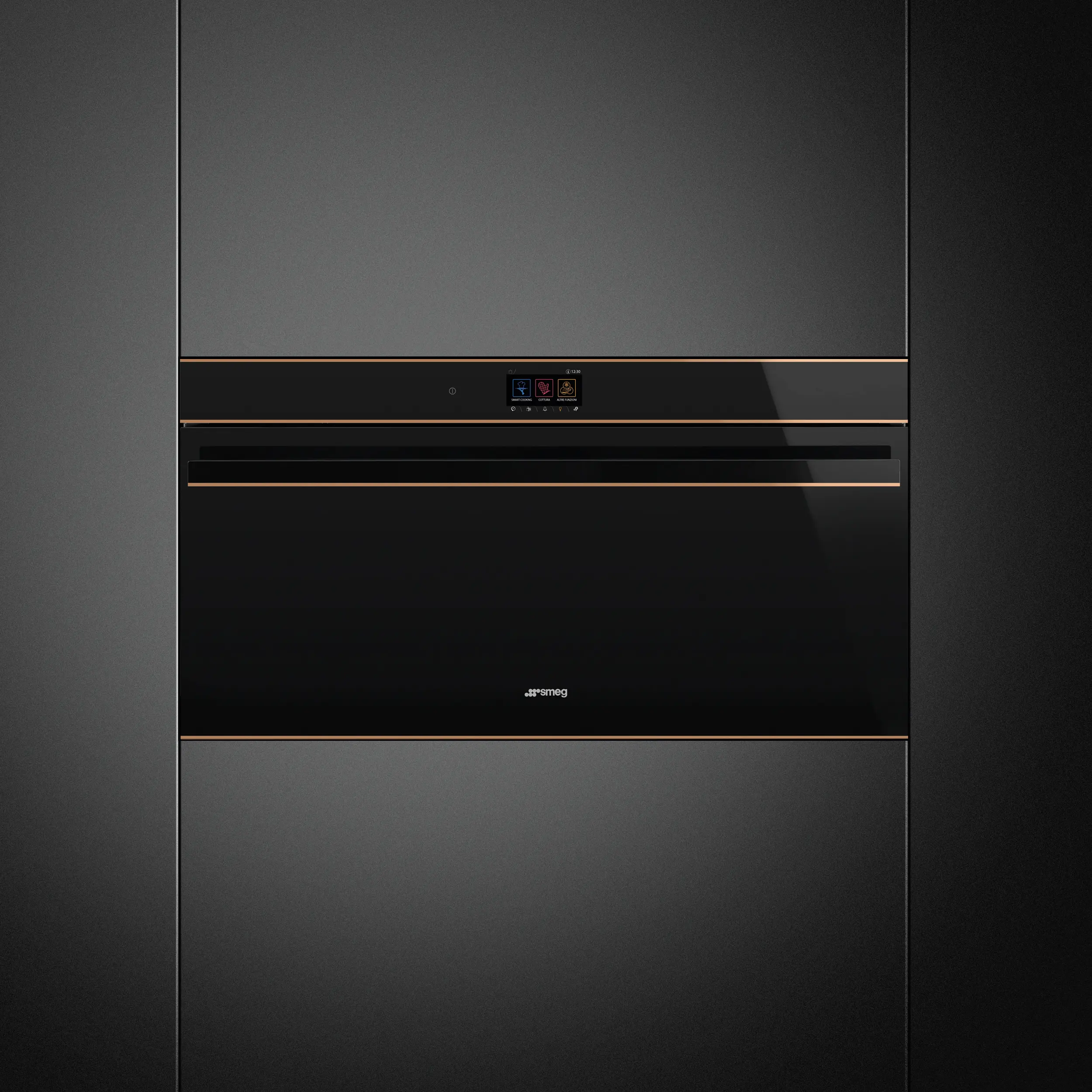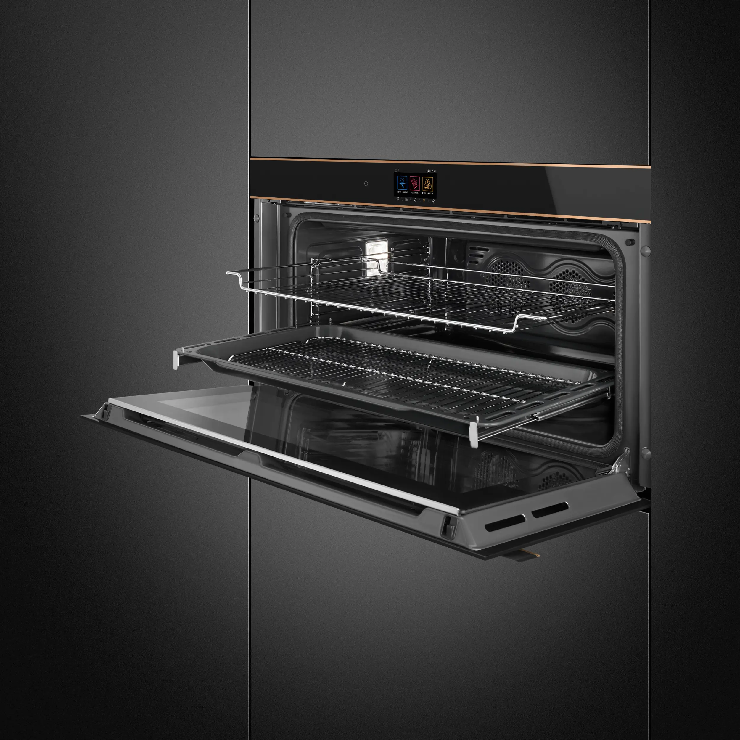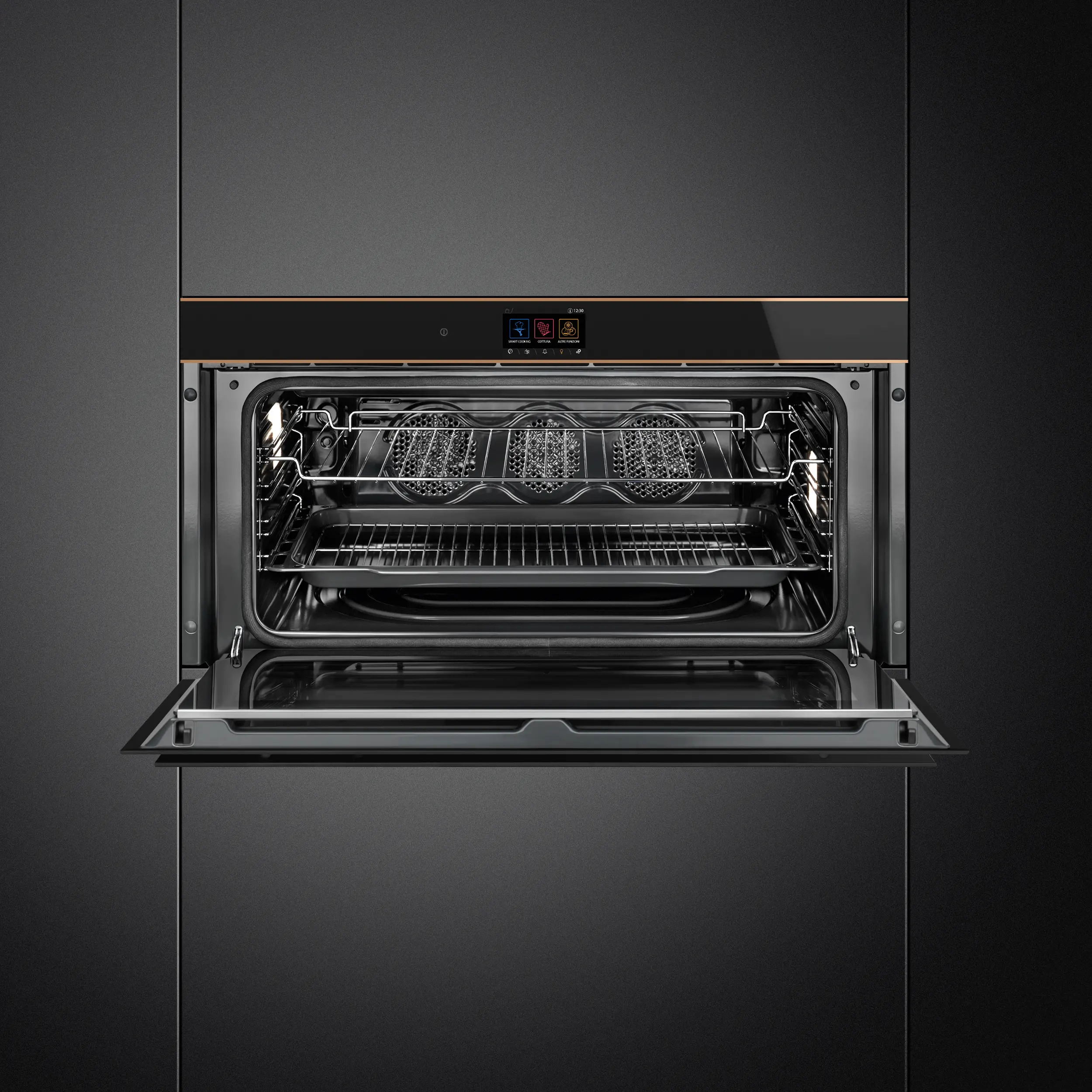 Black Eclipse glass with copper trim • 85L oven (Net capacity) • 150 Preset programmes• 10 functions • 4 cooking levels (telescopic guides included) • Variable grill • 30-280°C temperature range • Quadruple glazed, CoolTouch oven door (with SoftClose door mechanism) • Touch control colour display • 2 halogen lights • Child safety lock • 11 display languages