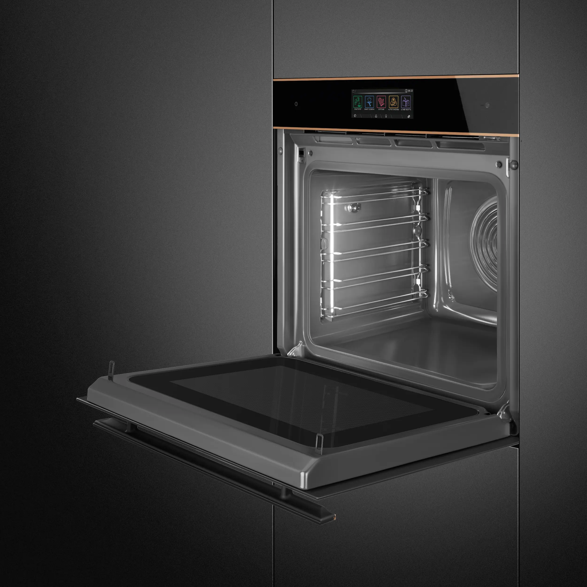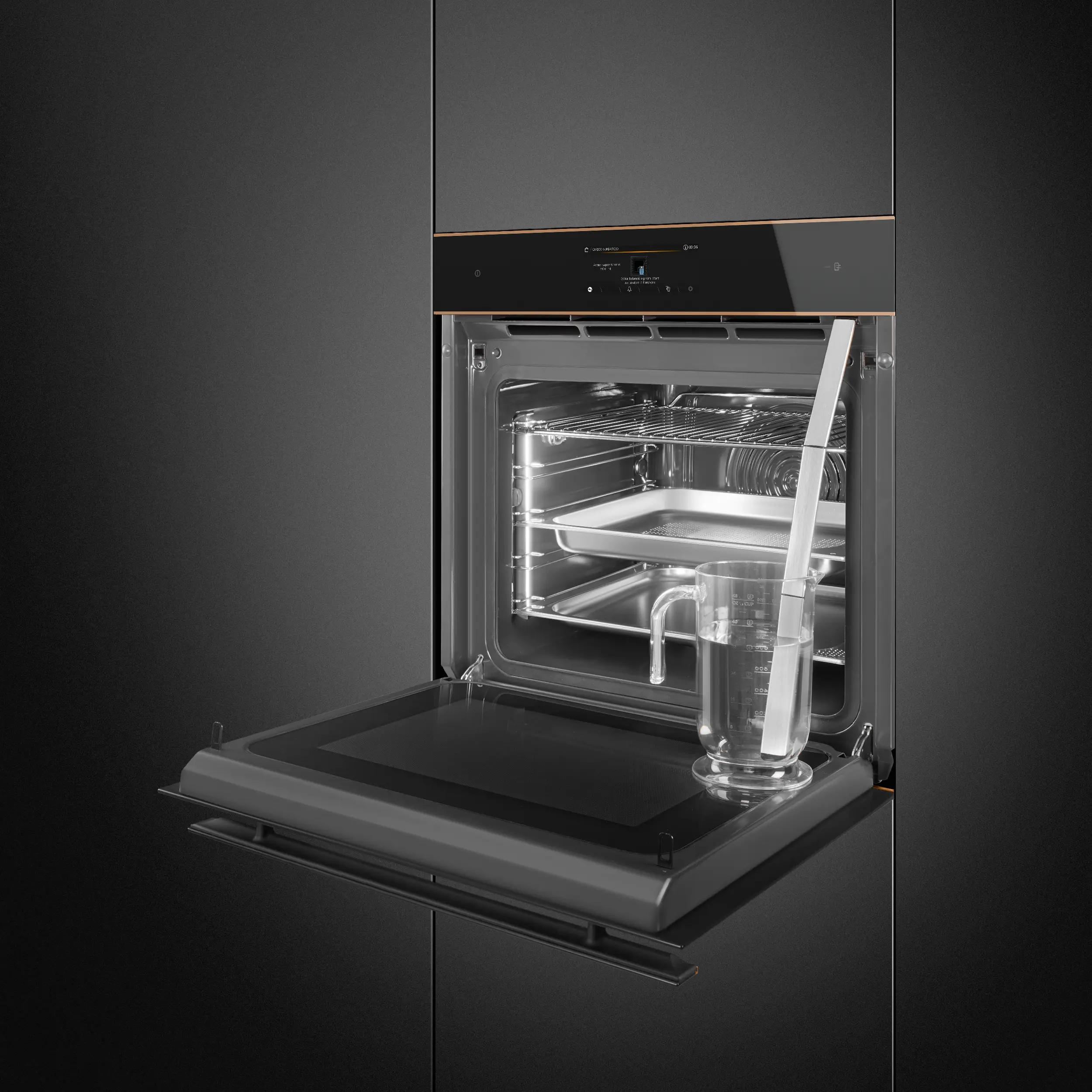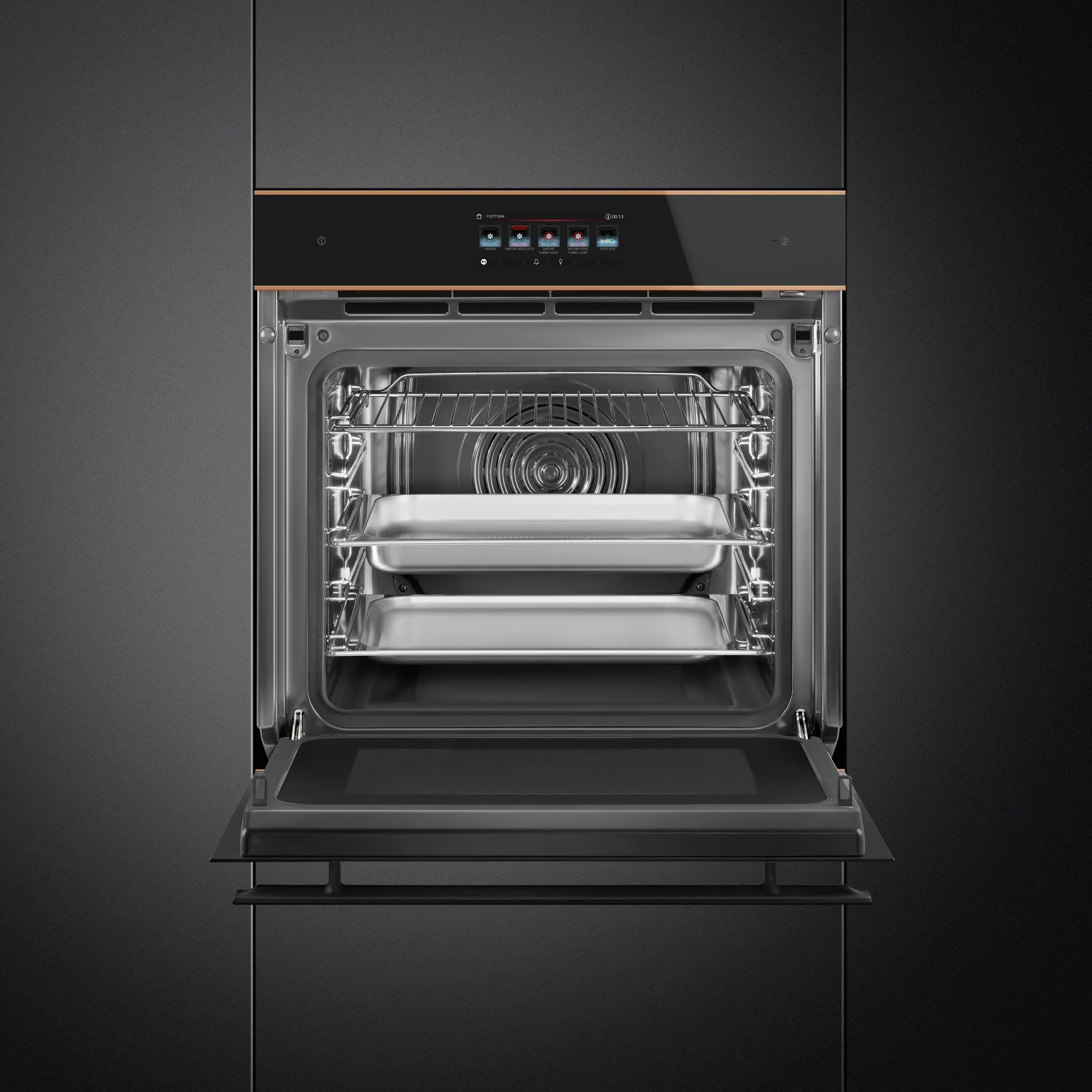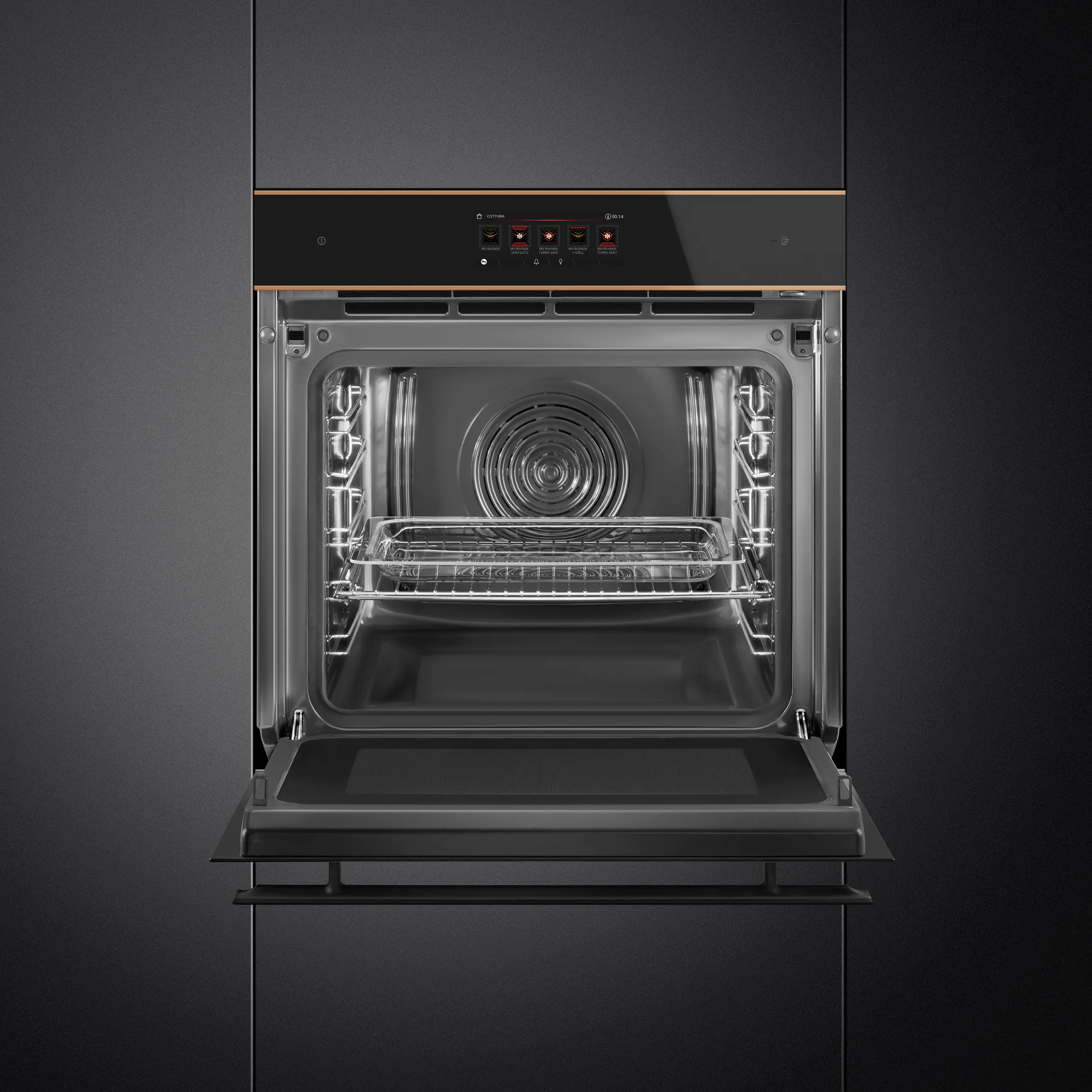 Black Eclipse glass with copper trim • 68L oven (Net capacity) • 26 Cooking functions •150 Automatic programmes • 3 + manual steam assisted cooking levels • 10 Customisable Recipes • 30-280°C temperature range • Quadruple glazed, CoolTouch oven door (with SoftClose door mechanism) • Vivo Screen Max Full Touch Display • Child safety lock • 20 display languages • Multi-level LED • 2L water tank capacity • 900W Microwave power range • Steam Range: 20-100%
