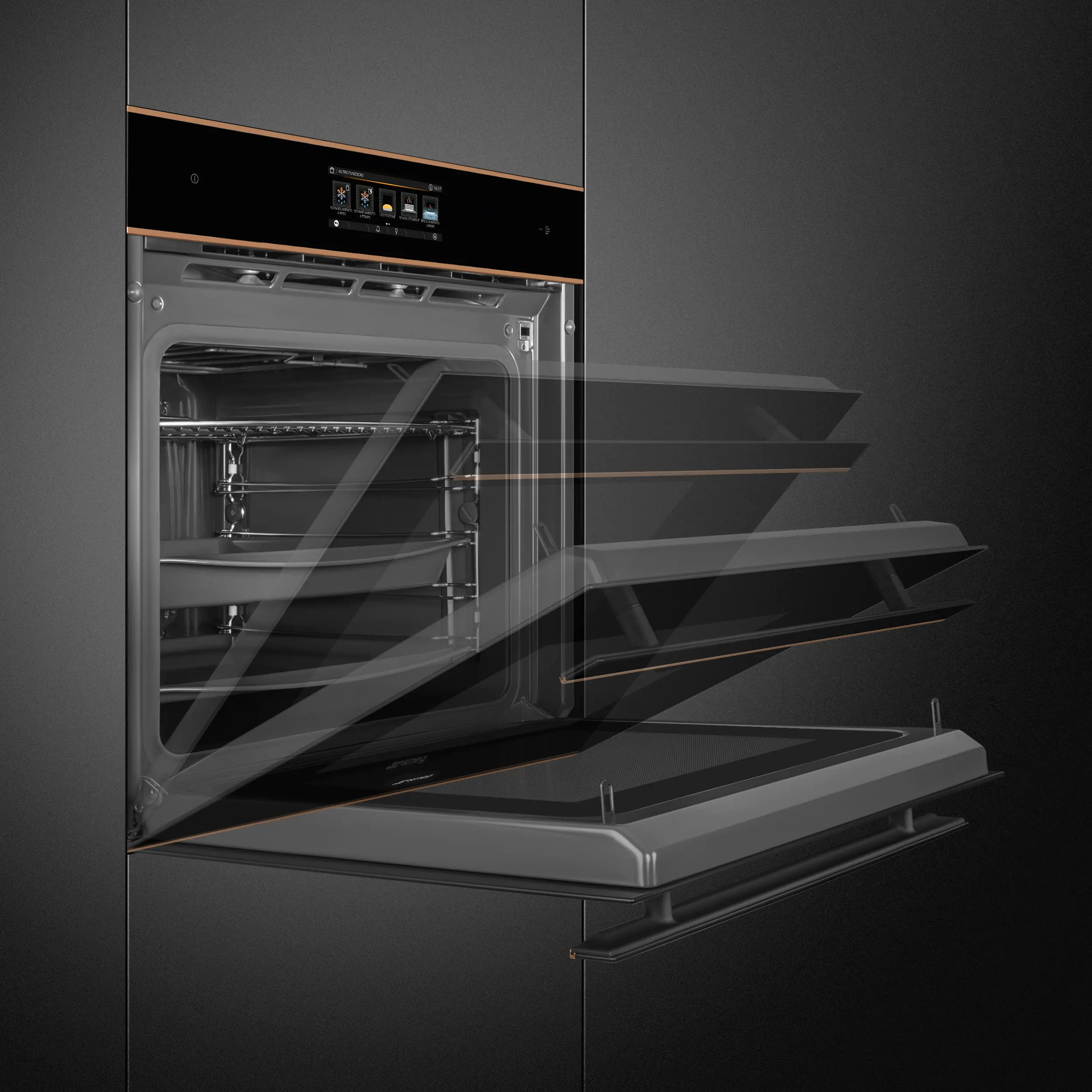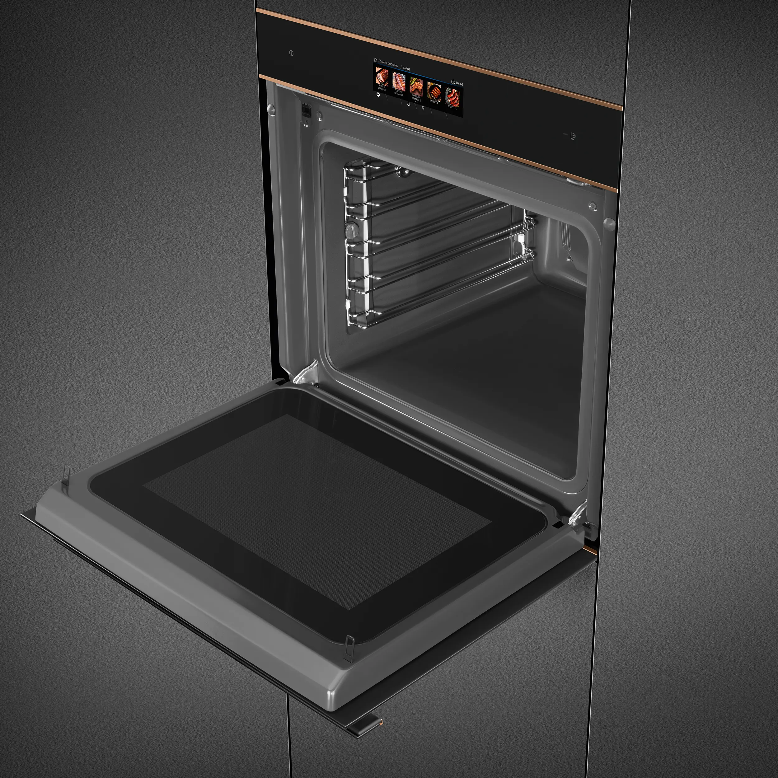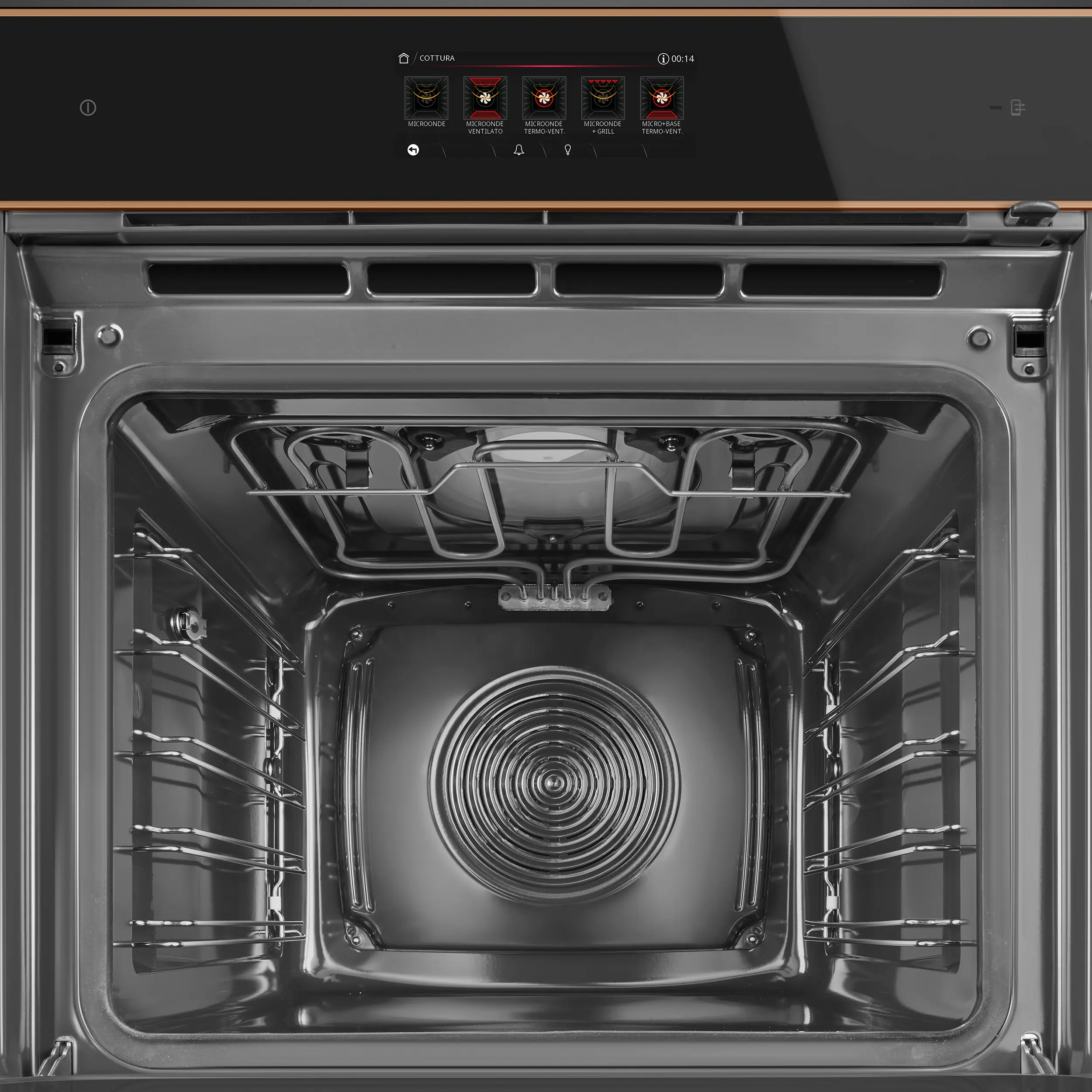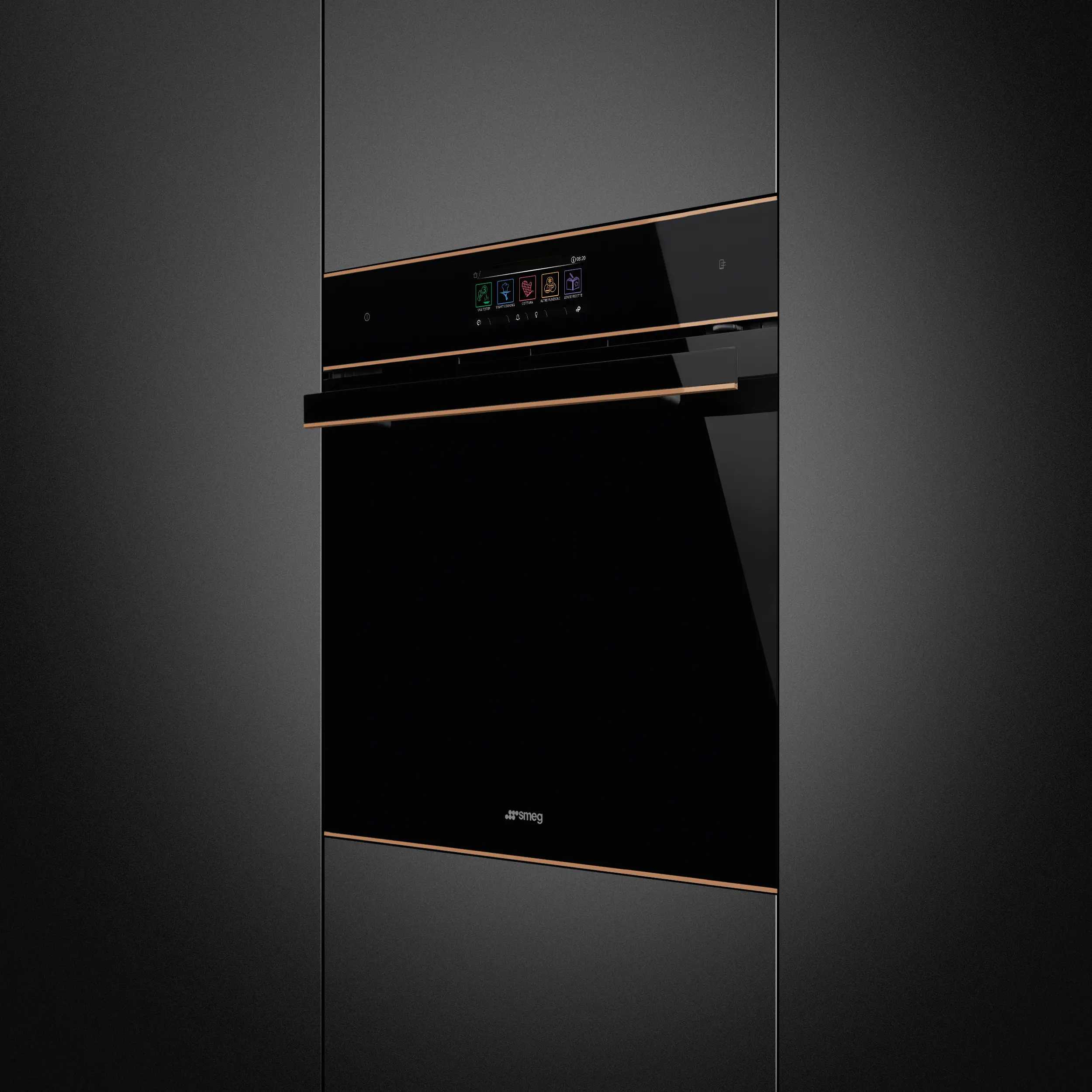 Black Eclipse glass with copper trim • 68L oven (Net capacity) • 26 Cooking functions •150 Automatic programmes • 3 + manual steam assisted cooking levels • 10 Customisable Recipes • 30-280°C temperature range • Quadruple glazed, CoolTouch oven door (with SoftClose door mechanism) • Vivo Screen Max Full Touch Display • Child safety lock • 20 display languages • Multi-level LED • 2L water tank capacity • 900W Microwave power range • Steam Range: 20-100%